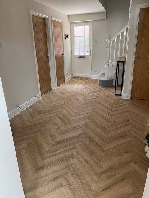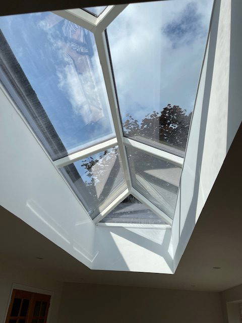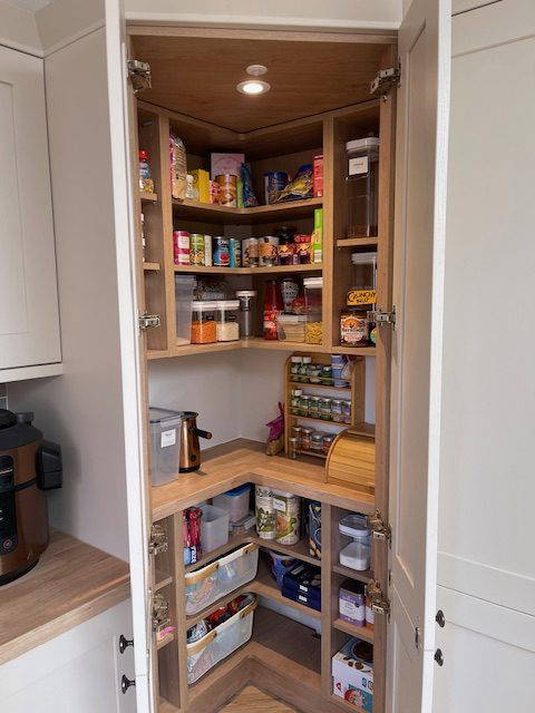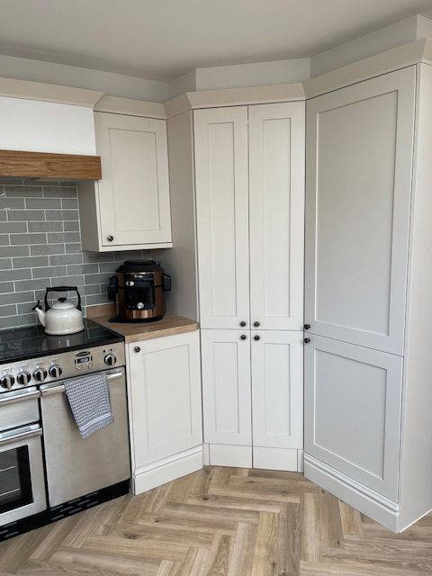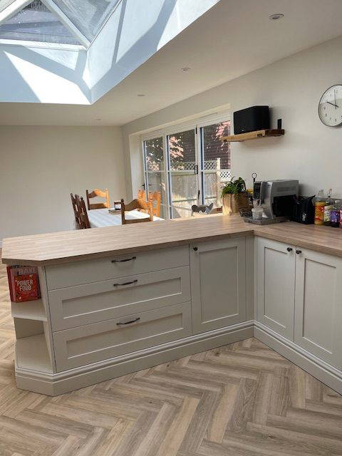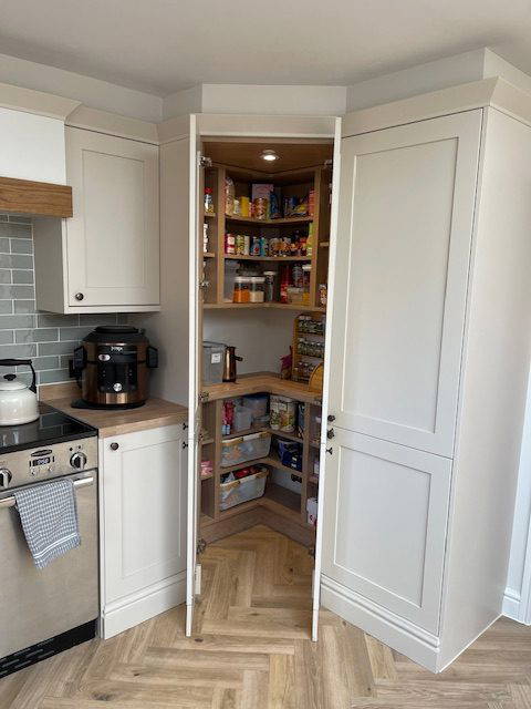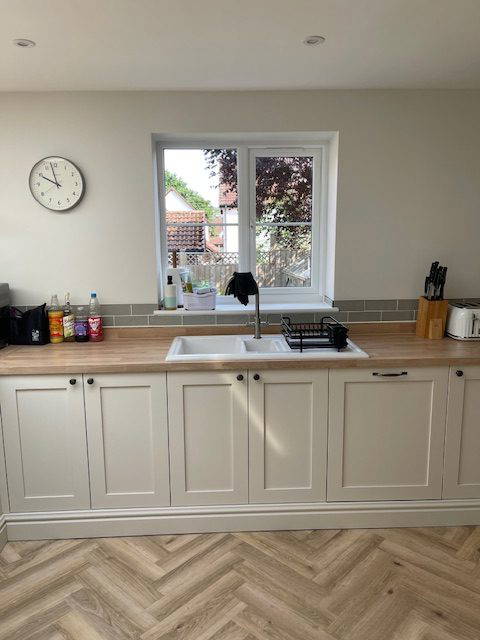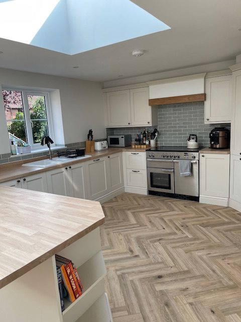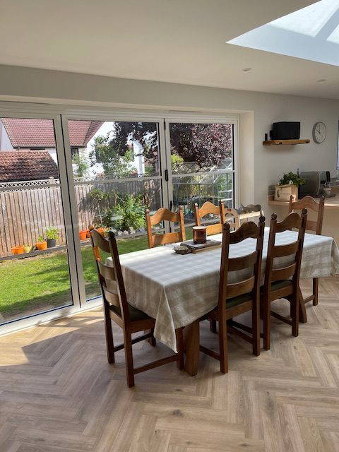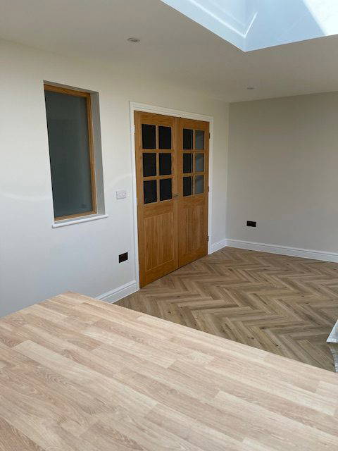 The new rear extension featured bifold doors, a window and large roof lantern to maximise light in this north facing room. We installed internal double doors where the patio doors had once been to link the living room space. A stunning large Howdens kitchen and herringbone LVT floor finish transformed this larger than average extension into a beautiful kitchen/dining space with enough room for a living area also. The walk in corner larder was a must have, a favourite amongst many of our clients where space allows!